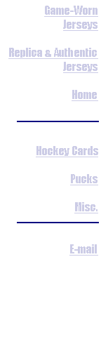 Welcome to my hockey jersey collection. I've been collecting replica jerseys for over a year and game-worn jerseys since January [although I have been a hockey addict for going on 9 years]. I only have a few and am always looking to add to my collection [provided I have the money to do so:-)]. Please feel free to take a look around. Hopefully I'll be updating my site with some new things very soon. ~Jennifer~